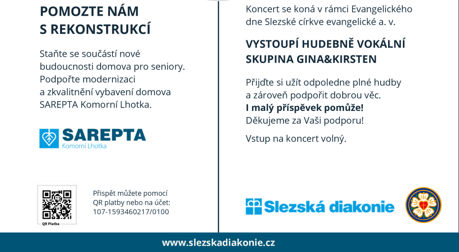 Výtěžek koncertu bude předán Slezské diakonii jako příspěvek na rekonstrukci Domova pro seniory Sarepta v Komorní Lhotce.