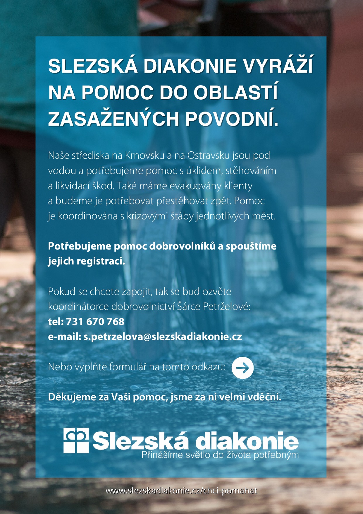Slezská diakonie vyráží na pomoc do oblastí zasažených povodní. Naše střediska na Krnovsku a na Ostravsku jsou pod vodou a potřebujeme pomoc s úklidem, stěhováním a likvidací škod. Také máme evakuovány klienty a budeme je potřebovat přestěhovat zpět.